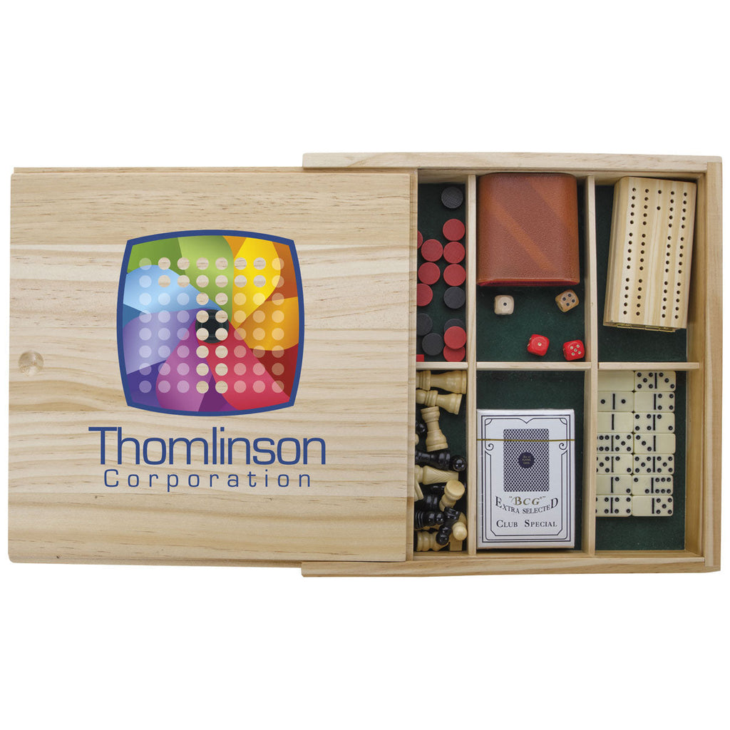- Includes: Instruction sheet, board and pieces for checkers and chess, dominoe pieces, cribbage board and pegs, standard deck of cards, and dice set.