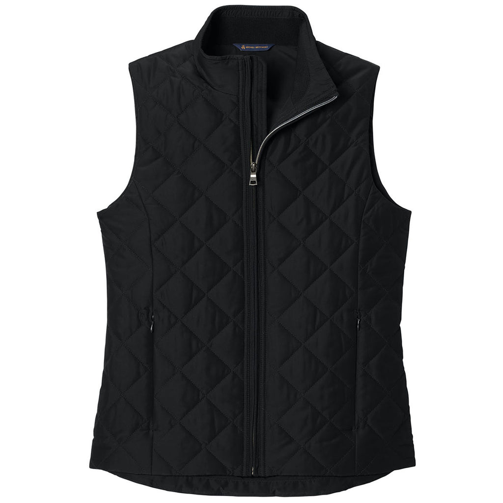 The Brooks Brothers Women's Deep Black Quilted Vest offers timeless style with corporate-ready branding opportunities. Its lightweight insulation provides warmth without bulk, making it ideal for layering in any season. Custom embroidery highlights company logos with sophistication, ensuring a polished finish. Perfect for employee apparel, executive gifts, or branded events, this vest combines elegance, comfort, and professional visibility.This product cannot ship outside of the United States.