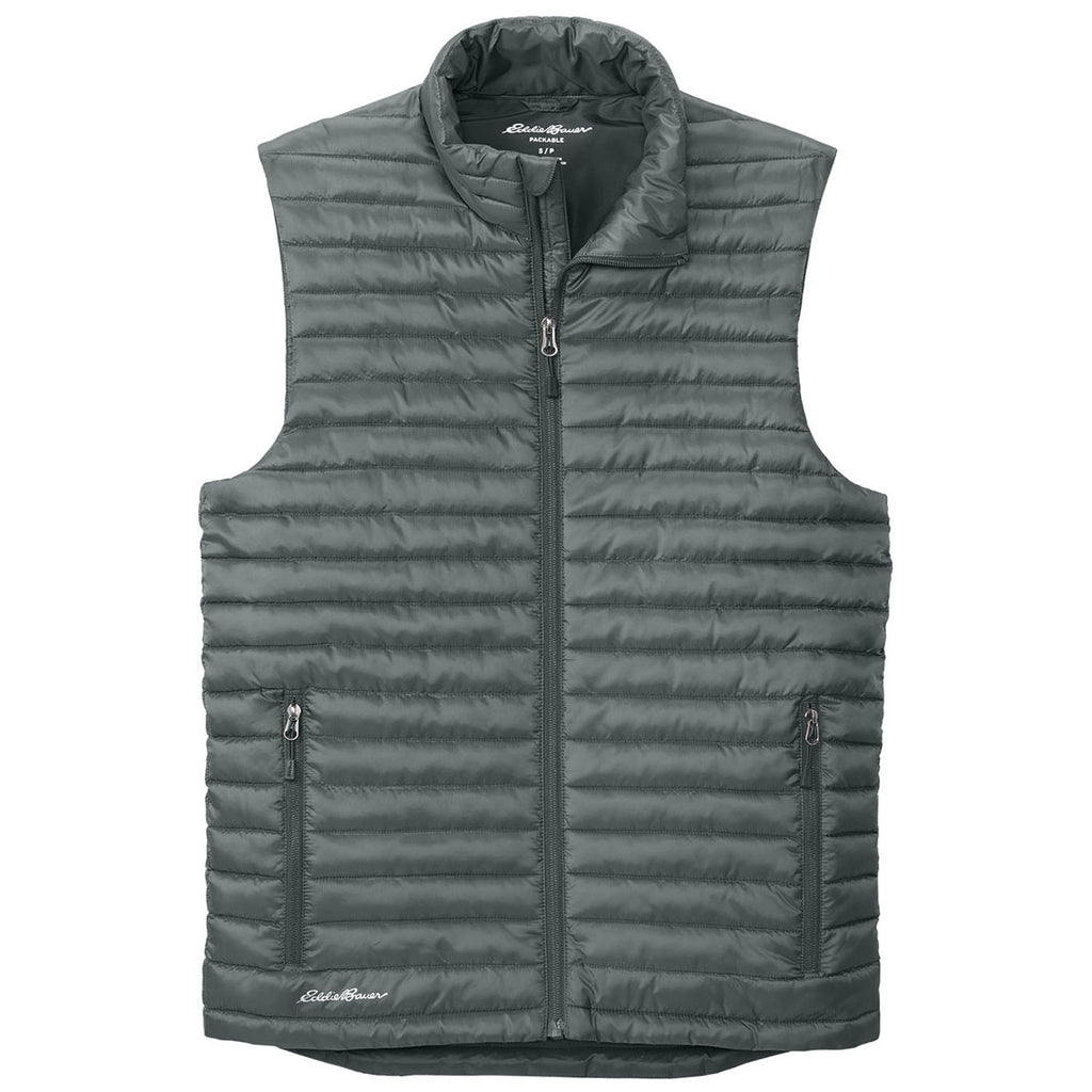 Eddie Bauer Men's Metal Grey Packable Quilted Vest with a custom design is a fun and functional way to stay toasty while enjoying the Great Outdoors. This packable vest can be worn and then easily packed away when it is no longer needed for the day. Perfect for hiking, camping, and hunting. Place an order right away.