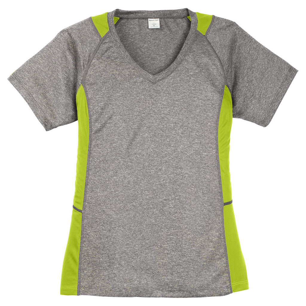 Sport-Tek Women's Vintage Heather/Lime Shock Heather Colorblock Contender V-Neck Tee