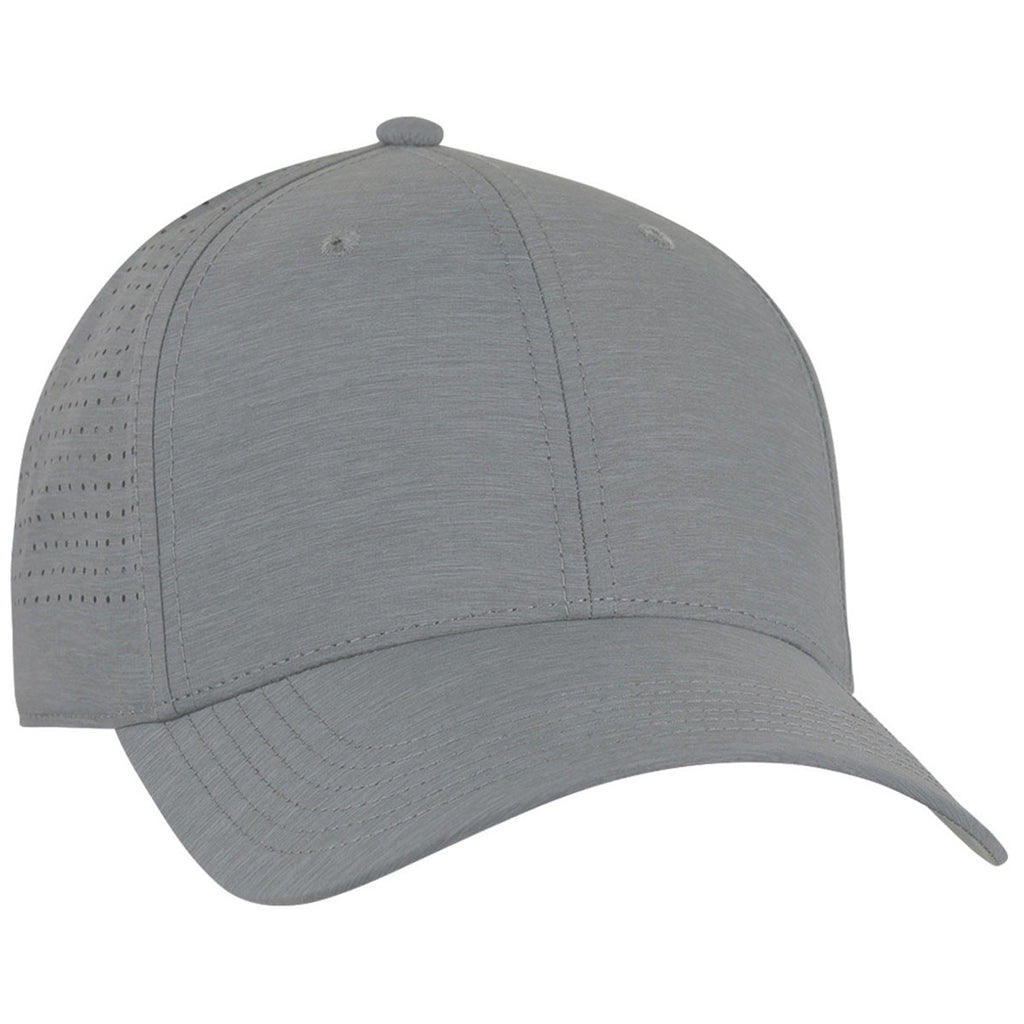 Create a corporate logo for the Ahead Light Grey Heather Brezo Performance Cap made of heathered perforated fabric with a silicone hook and loop closure. This trendy cap is structured with a mid-fit and pre-curved visor to keep you cool and protected whether you are chilling in the stands, playing your favorite sport, or just relaxing while running errands.