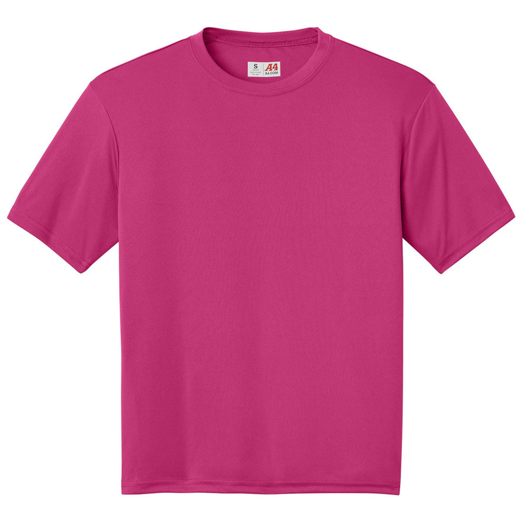 Keep cool with the A4 Men's Fuchsia Cooling Performance Short Sleeve Tee. Built with moisture-wicking fabric, this tee is designed for workouts, sports, or active jobs. Customize it with your logo to create branded apparel that's functional and comfortable. Its lightweight design makes it a reliable choice for corporate promotions or team uniforms.Highlights
