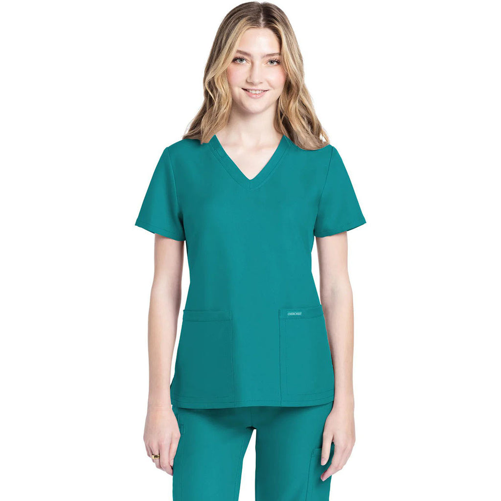 Cherokee Women's Teal Blue 2-Pocket V-Neck Top with a corporate logo is a must-have for those in multiple professions. Perfect for those in the medical field, those who work with animals, or those who provide in-home care, this comfortable option has side vents, antimicrobial and moisture-wicking technology, and roomy patch pockets.