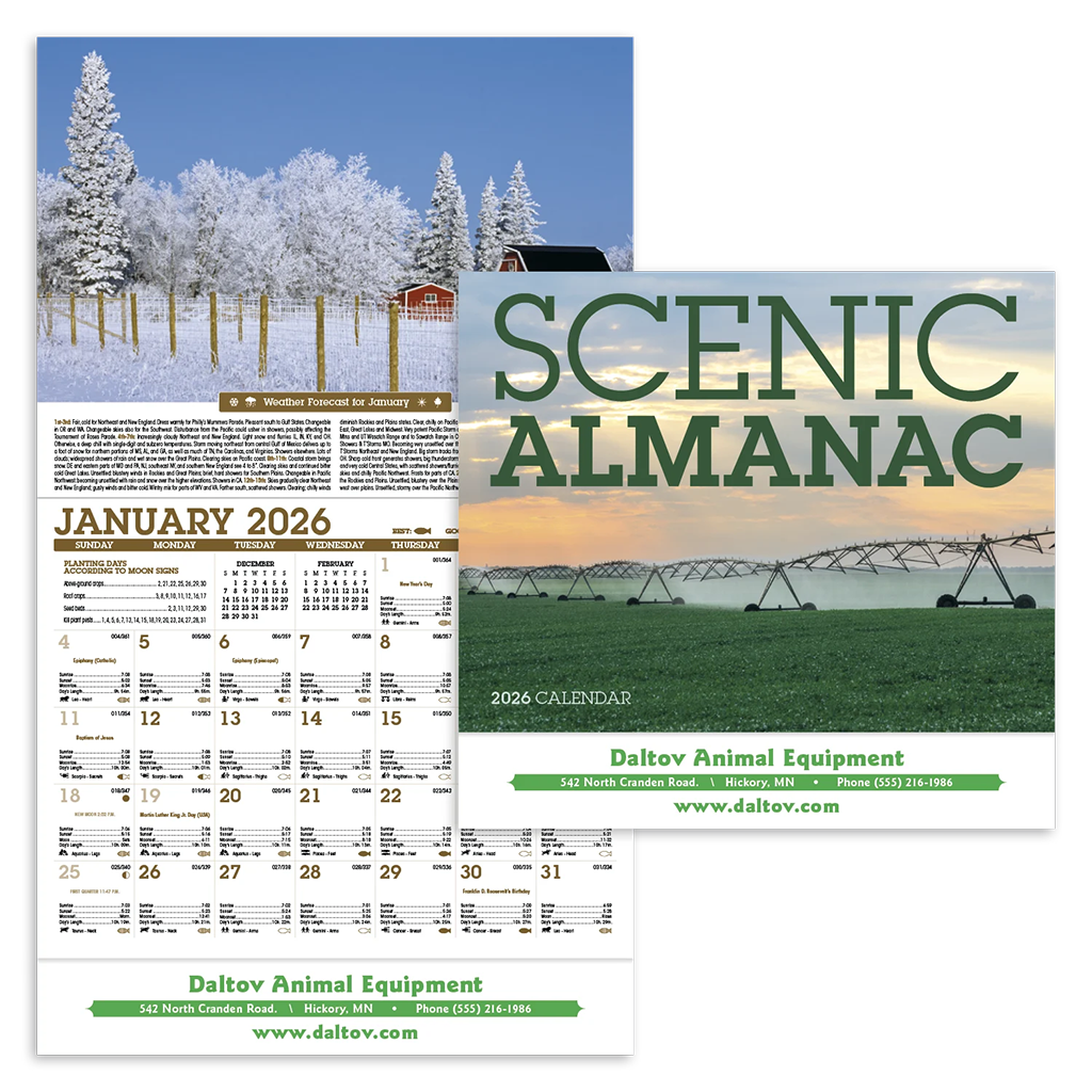 The Triumph Calendars Scenic Almanac with your custom logo will be a weather watcher's dream, with gorgeous weather-based landscapes each month. It is perfect for hanging in an office or home to easily keep track of important dates. Order plenty in time for the upcoming new year to help everyone start things off right.The minimum order for this product is 150 pieces.