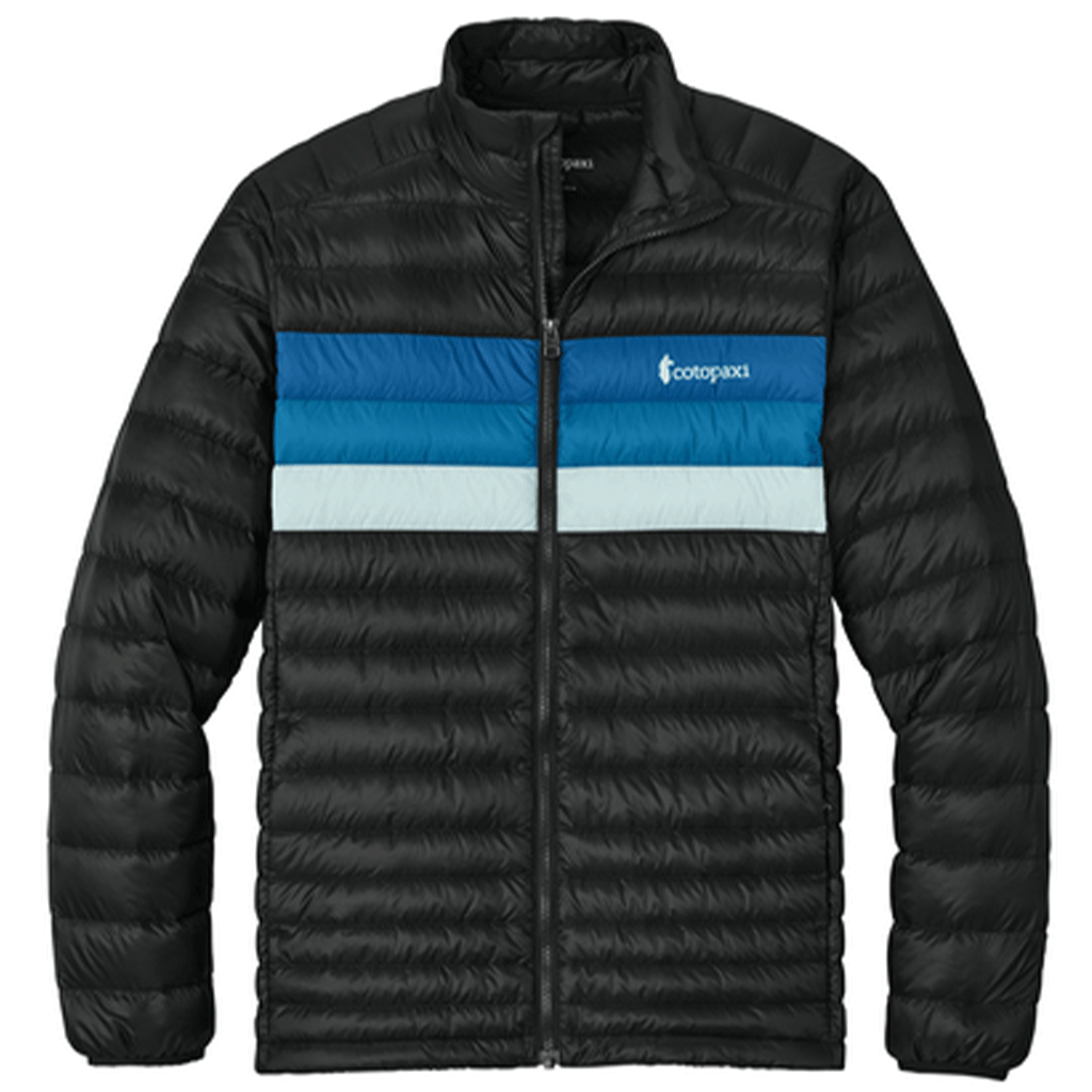 The Cotopaxi Men's Black/Atlantic Fuego Down Jacket offers superior warmth and lightweight performance for outdoor adventures or everyday wear. Crafted with sustainable down and a durable, water-resistant shell, it provides comfort and protection in cooler conditions. Ideal for outdoor fun or custom outerwear, this jacket blends functional style, ethical materials, and all-day versatility.This product can only ship within the United States and Canada.
