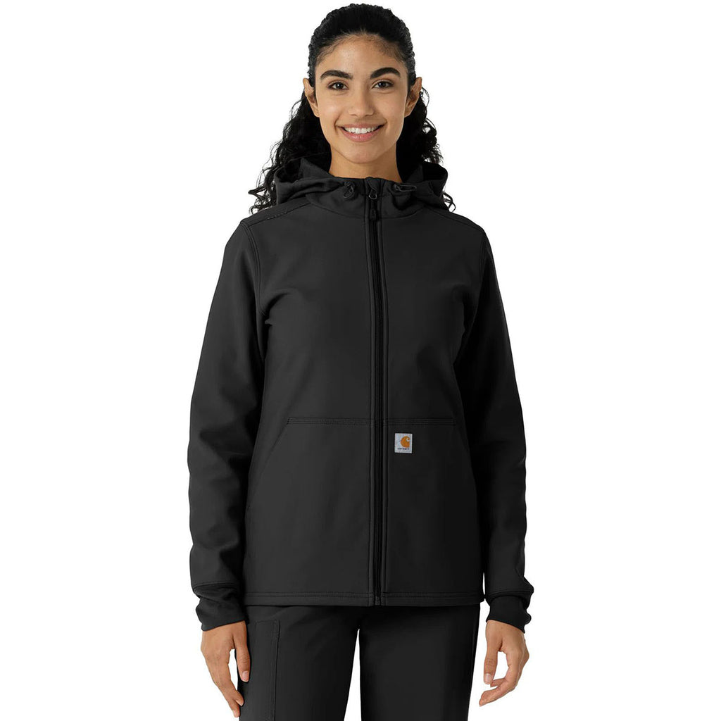 The Carhartt Women's Black Four-Pocket Bonded Fleece Hoodie is a functional and professional layering piece, ideal for healthcare uniforms and team apparel. Made from durable 100% polyester fleece, it offers lightweight warmth and flexibility. Designed with a three-piece hood, adjustable drawcord, and badge loop for workplace identification, this hoodie also features two front handwarmer pockets with flaps and an internal stethoscope pocket for added utility. The full-zip front with chin guard and slightly extended back hem provide a comfortable fit for active workdays. Add your logo to create a polished, branded layer suitable for cooler environments and healthcare team uniforms.