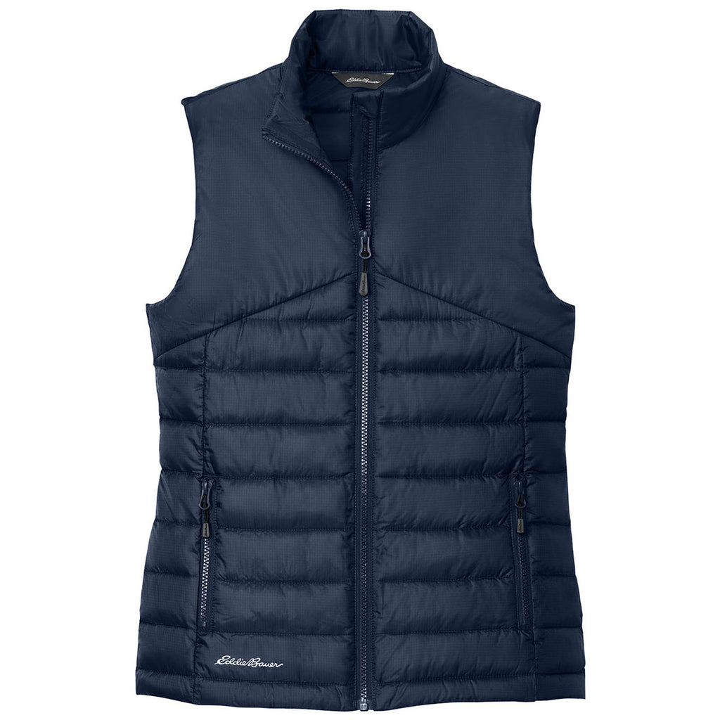 Eddie Bauer Women's River Blue Navy Quilted Vest with a custom logo is a fun and fashionable way to stay warm. Worn as an outer or middle layer, this vest will keep you warm without creating much added bulk. The mock neck and full zip front make this great for hiking, running, or general day-to-day errands. Place an order today.This product can only ship within the United States, Puerto Rico, Canada, and Mexico.