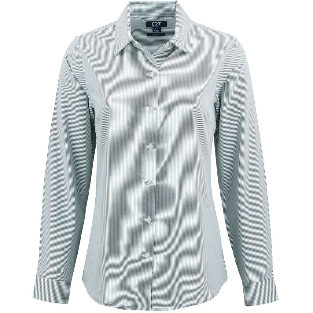 The Cutter & Buck Women's Hunter/White Skyline Epic Confidence Recycled Pinstripe Long Sleeve Dress Shirt brings sharp, custom branding to eco-conscious business wear. Designed for comfort and style, its recycled stretch fabric delivers easy movement with tailored lines. Perfect for corporate gifting, uniforms, or resale with elevated sustainability.Corresponding Men's Style: Cutter & Buck Men's Hunter/White Skyline Epic Confidence Recycled Pinstripe Long Sleeve Dress Shirt